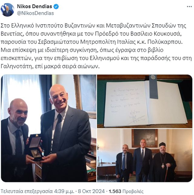 «Στο Ελληνικό Ινστιτούτο Βυζαντινών και Μεταβυζαντινών Σπουδών της Βενετίας, όπου συναντήθηκα με τον Πρόεδρό του Βασίλειο Κουκουσά, παρουσία του Σεβασμιώτατου Μητροπολίτη Ιταλίας κ.κ. Πολύκαρπου.