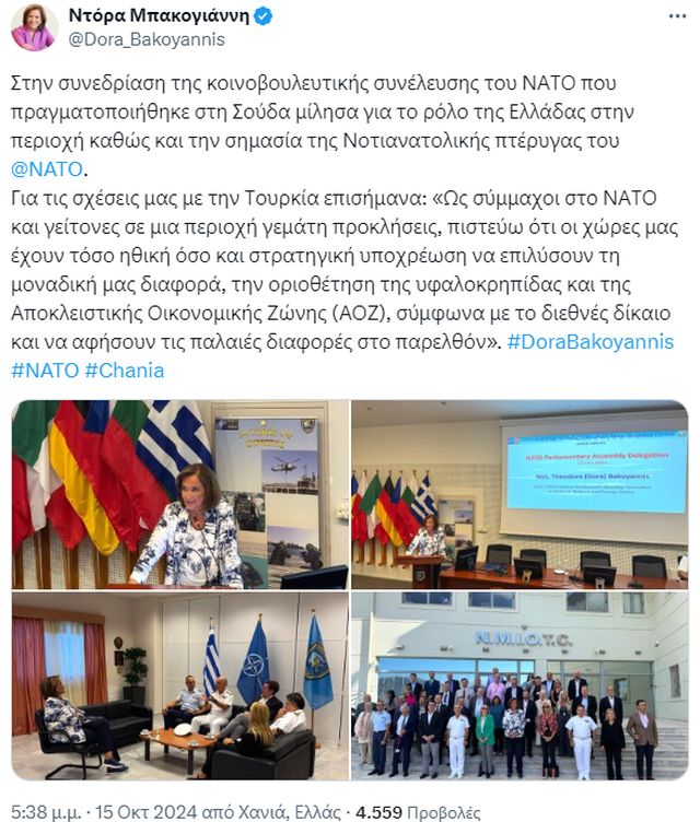 Στην ομιλία της η κ. Μπακογιάννη ανέλυσε τις τρέχουσες ανησυχητικές εξελίξεις στην Ανατολική Ευρώπη και τη Μέση Ανατολή και αναφέρθηκε στο ρόλο της Ελλάδας στην περιοχή, στη σημασία της Νοτιοανατολικής πτέρυγας του ΝΑΤΟ, καθώς και στις σχέσεις Ελλάδας–Τουρκίας επισημαίνοντας τα εξής: