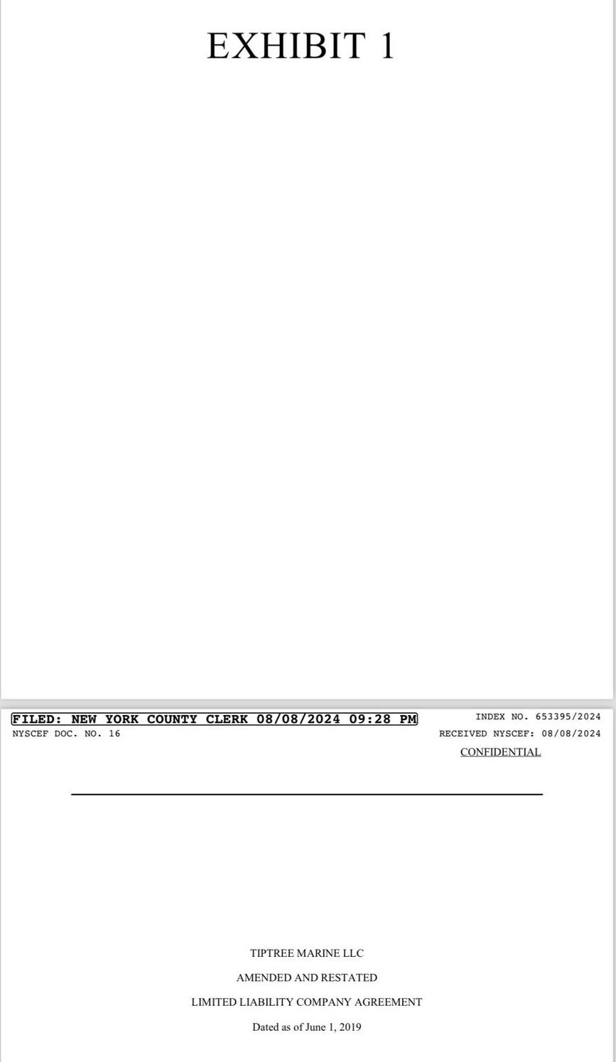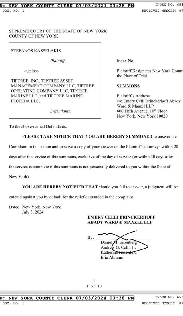«Κατά τη διάρκεια της απασχόλησής του στην Tiptree, μεταξύ 18 Ιανουαρίου 2018 και 13 Μαρτίου 2023 ο Στέφανος Κασσελάκης διετέλεσε Διευθύνων Σύμβουλος (CEO) σε ΚΑΘΕ ΘΥΓΑΤΡΙΚΗ που υπήρχε στην Tiptree Marine—δλδ όσων αφορούν ξηρό φορτίο, δεξαμενόπλοια, αστακούς, διαχείριση χρηματοοικονομικού κινδύνου, oχήματα ειδικού σκοπού και άλλες οντότητες». Αυτά τα λέει αυτολεξεί ο ίδιος σε δικόγραφο που κατέθεσε στις 3 Ιουλίου 2024 στο Supreme Court της Νέας Υόρκης σε αγωγή του κατά της Tiptree (CASE 653395/2024, DOC. 1).