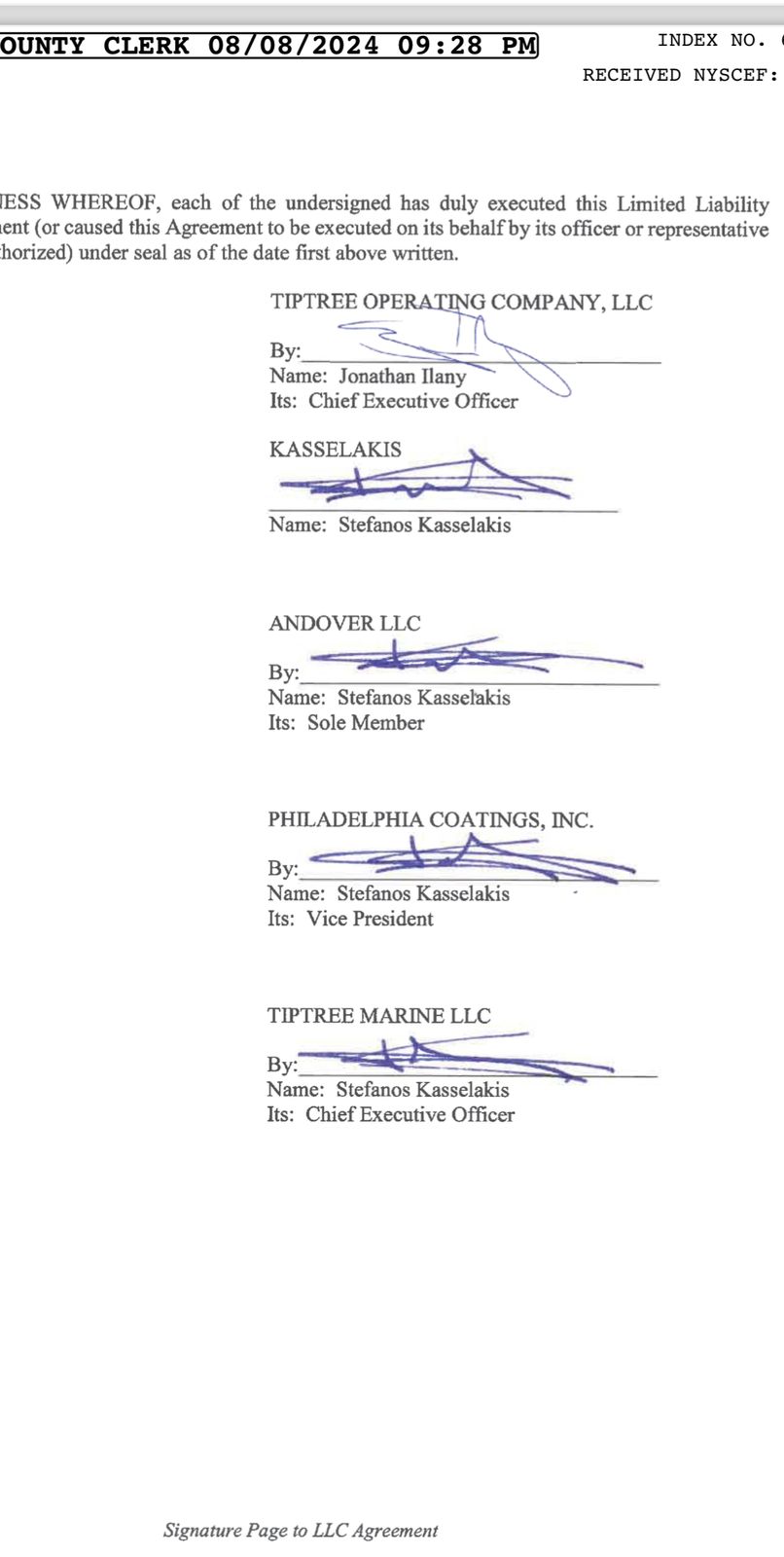 Επίσης, σε έγγραφο που κατέθεσε τον Αύγουστο στο δικαστήριο της Νέας Υόρκης η TIPTREE στα πλαίσια της δίκης που ο Κασσελάκης της ζητάει λεφτά φαίνεται καθαρά μέσα από τις υπογραφές που περιέχει πως ο Κασσελάκης έχει σχέση με κάποιες από τις εταιρείες ως CEO ή ως μέτοχος: