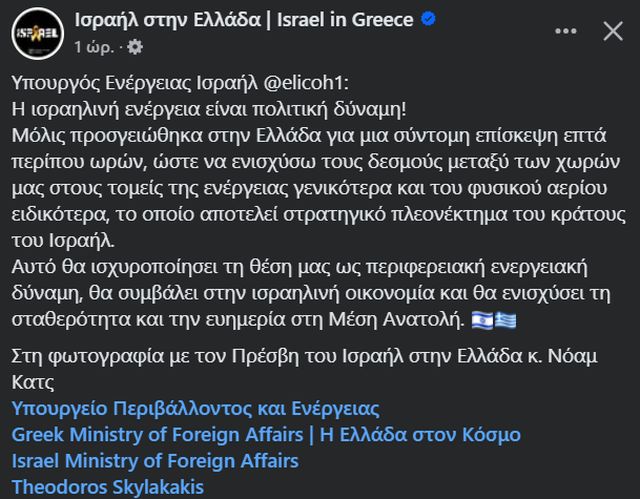 Ο Ισραηλινός υπουργός Ενέργειας, Έλι Κοέν έφτασε στην Αθήνα τη Δευτέρα (23/12) για μια «γρήγορη επίσκεψη περίπου επτά ωρών», όπως ανέφερε και ο ίδιος με ανάρτησή του στο «X».