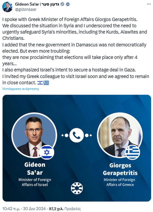 Ο υπουργός Εξωτερικών του Ισραήλ, Γκίντεον Σαάρ, επεσήμανε στον Γιώργο Γεραπετρίτη την ανάγκη να προστατευθούν οι Ελληνορθόδοξοι -και όλοι οι χριστιανοί- όπως επίσης οι Κούρδοι και οι Αλαουίτες, της Συρίας.