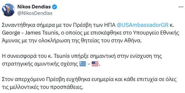 «Συναντήθηκα σήμερα με τον Πρέσβη των ΗΠΑ @USAmbassadorGR κ. George – James Tsunis, ο οποίος με επισκέφθηκε στο Υπουργείο Εθνικής Άμυνας με την ολοκλήρωση της θητείας του στην Αθήνα.