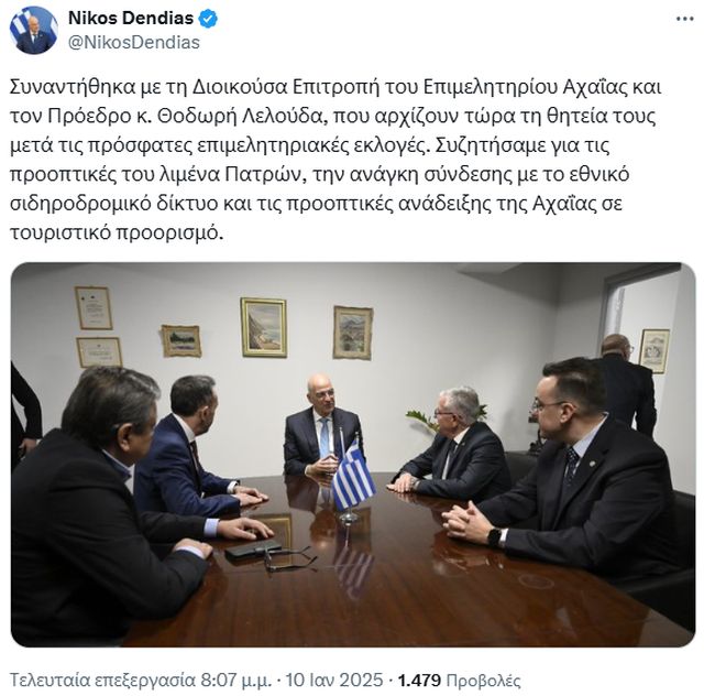 Ο Νίκος Δένδιας την Παρασκευή 10/01/25 συναντήθηκε με τη Διοικούσα Επιτροπή του Επιμελητηρίου Αχαΐας και τον πρόεδρο Θοδωρή Λελούδα, οι οποίοι ξεκινούν τώρα τη θητεία τους μετά τις πρόσφατες επιμελητηριακές εκλογές.