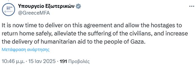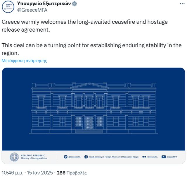 «Η Ελλάδα χαιρετίζει θερμά την πολυαναμενόμενη συμφωνία κατάπαυσης του πυρός και απελευθέρωσης ομήρων.