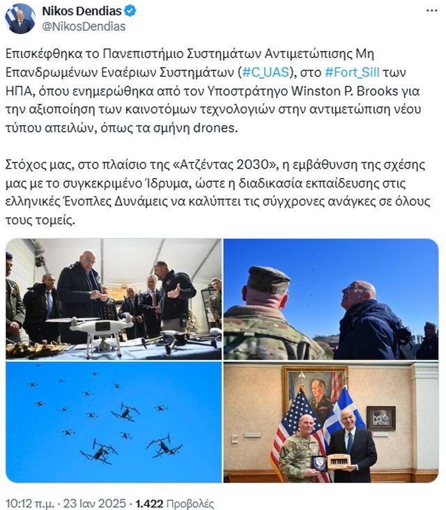 «Είχα σήμερα τη χαρά να βρεθώ εδώ, στο «Φορτ Σιλ», όπου βρίσκεται το Πανεπιστήμιο Αντι-drone εκπαίδευσης των ΗΠΑ.
