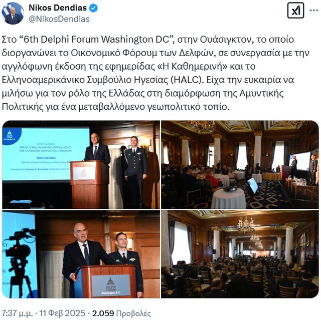 Η συνέχιση της εμβάθυνσης των ισχυρών αμυντικών σχέσεων Ελλάδας-ΗΠΑ που οικοδομήθηκαν κατά τη διάρκεια της πρώτης θητείας του Ντόναλντ Τραμπ και συνεχίστηκαν από τη διοίκηση του Τζο Μπάιντεν αποτελεί σημαντικό μέρος της στρατηγικής της Αθήνας, υπογράμμισε ο υπουργός Άμυνας Νίκος Δένδιας κατά τη διάρκεια ομιλίας που πραγματοποίησε το Συνέδριο των Δελφών στην Ουάσιγκτον.