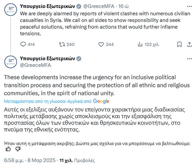Το ελληνικό υπουργείο Εξωτερικών, με αναρτήσεις του στο «Χ» το απόγευμα του Σαββάτου 08/03, εξέφρασε τη βαθιά ανησυχία για την τρέχουσα κατάσταση στη Συρία.