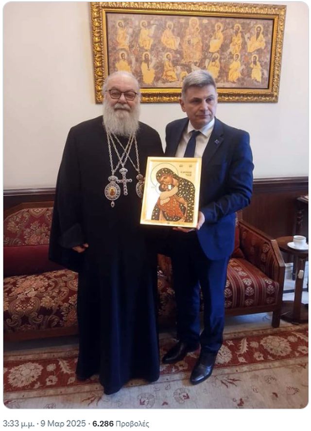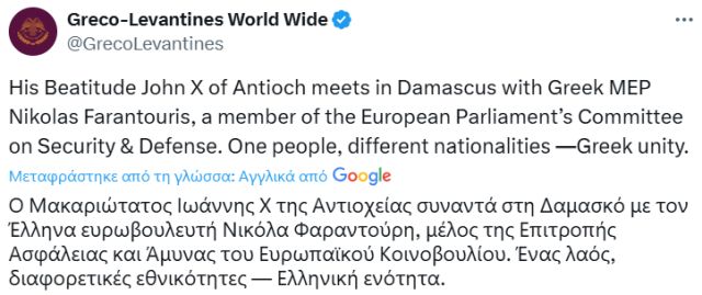 «Η Αυτού Μακαριότης Ιωάννης Ι΄ της Αντιοχείας συναντάται στη Δαμασκό με τον Έλληνα ευρωβουλευτή Νικόλα Φαραντούρη, μέλος της Επιτροπής Ασφάλειας και Άμυνας του Ευρωπαϊκού Κοινοβουλίου. Ένας λαός, διαφορετικές εθνικότητες [σ.σ. εννοεί υπηκοότητες, ιθαγένειες] — ελληνική ενότητα».