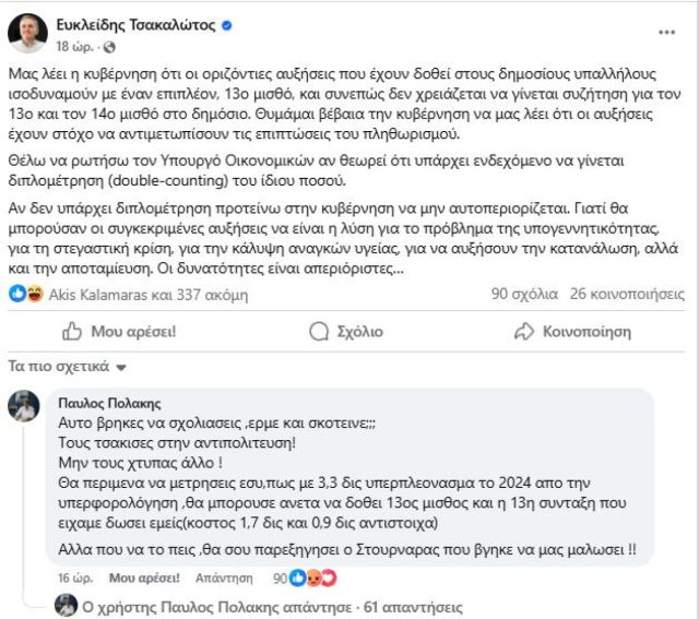 Ο Παύλος Πολάκης μέσω Facebook συνέθλιψε τον Ευκλείδη Τσακαλώτο, με αφορμή ανάρτηση του πρώην υπουργού Οικονομικών της κυβέρνησης ΣΥΡΙΖΑ σχετικά με τον 13ο και 14ο μισθό.