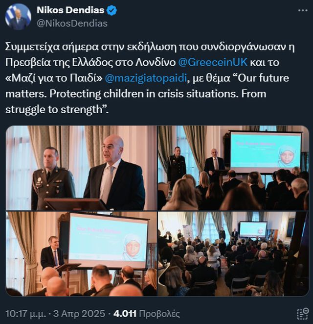 Την Πέμπτη, 3 Απριλίου, ο Νίκος Δένδιας δημοσίευσε στο «Χ» ότι συμμετείχε την Πέμπτη στην εκδήλωση που συνδιοργάνωσαν η Πρεσβεία της Ελλάδος στο Λονδίνο και το «Μαζί για το Παιδί», με θέμα «Our future matters. Protecting children in crisis situations. From struggle to strength» («Το μέλλον μας έχει σημασία. Προστατεύοντας τα παιδιά σε καταστάσεις κρίσης. Από τον αγώνα στη δύναμη»).