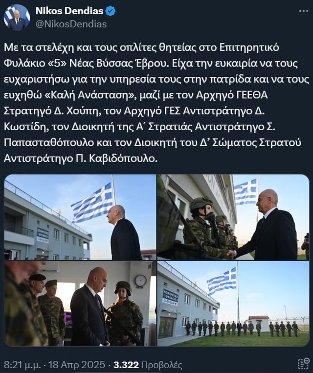 Τη Μεγάλη Παρασκευή 18 Απριλίου 2025, ο Υπουργός Εθνικής Άμυνας, Νίκος Δένδιας, επισκέφθηκε το Επιτηρητικό Φυλάκιο (ΕΦ) «5» στον Έβρο, στην περιοχή ευθύνης της XVI Μηχανοκίνητης Μεραρχίας Πεζικού (M/K ΜΠ) Διδυμοτείχου.