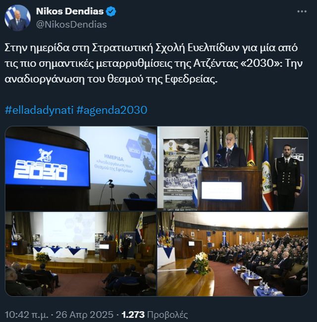 Ο Υπουργός Εθνικής Άμυνας, Νίκος Δένδιας, παρευρέθη στις 26 Απριλίου 2025 στην Ημερίδα με θέμα «Αναδιοργάνωση του Θεσμού της Εφεδρείας», που διοργανώθηκε από το Γενικό Επιτελείο Στρατού (ΓΕΣ) στην Αίθουσα Αμφιθεάτρου της Στρατιωτικής Σχολής Ευελπίδων (ΣΣΕ), στο πλαίσιο της «Ατζέντας 2030».