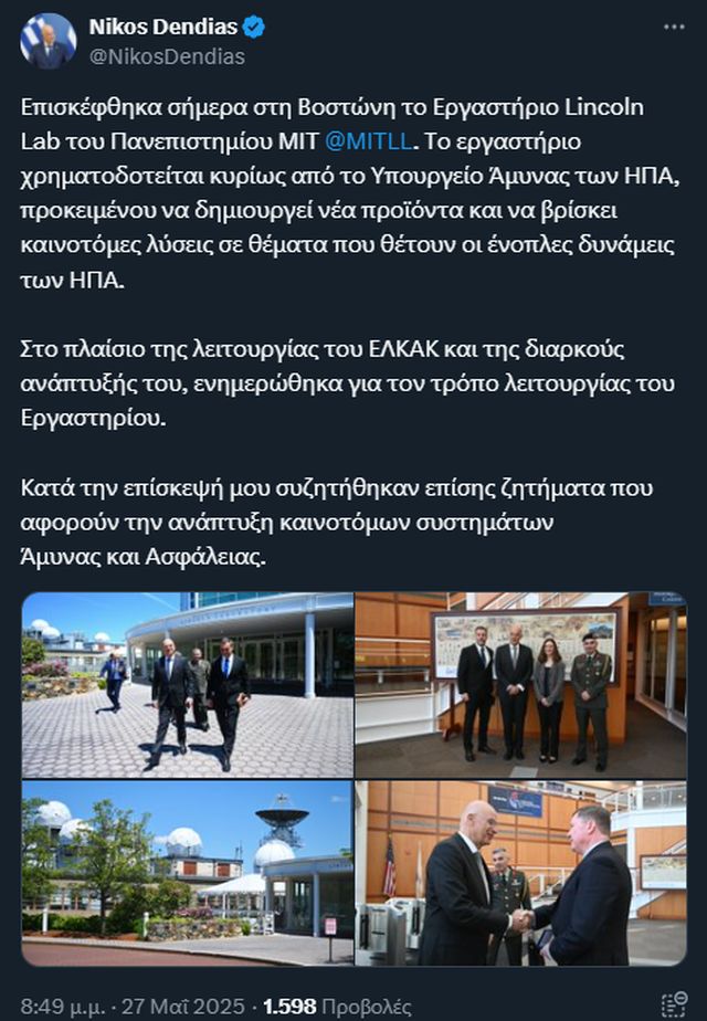 Στην επίσκεψή του στο ΜΙΤ «Lincoln Laboratory», ο κ. Δένδιας παρακολούθησε συγκεκριμένα ενημέρωση από τη διευθύντριά του Δρ. Μελίσσα Γκούντχαρτ Τσόι για τη λειτουργία και τις δραστηριότητες του Διεπιστημονικού Κέντρου Έρευνας και Ανάπτυξης (FFRDC), το οποίο χρηματοδοτείται από την ομοσπονδιακή κυβέρνηση των ΗΠΑ και διευθύνεται από το MIT για το υπουργείο Άμυνας των ΗΠΑ.