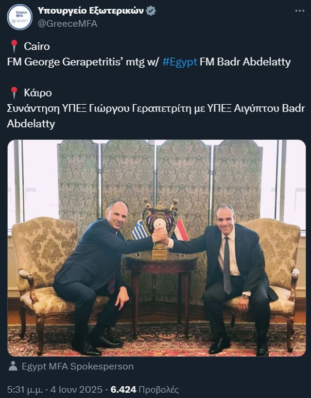 »Ο Υπουργός Αμπντελάτι εξήρε τους ιστορικούς δεσμούς μεταξύ Αιγύπτου και Ελλάδας, καθώς και τις εξαιρετικές πολιτικές, οικονομικές και πολιτιστικές τους σχέσεις, οι οποίες κορυφώθηκαν τον περασμένο μήνα με την αναβάθμιση των σχέσεων σε Στρατηγική Εταιρική Σχέση κατά την πρώτη συνάντηση του Συμβουλίου Συνεργασίας Υψηλού Επιπέδου στην Αθήνα, υπό την προεδρία του Προέδρου Αμπντέλ Φατάχ αλ Σίσι και του Πρωθυπουργού της Ελλάδας, Κυριάκου Μητσοτάκη.