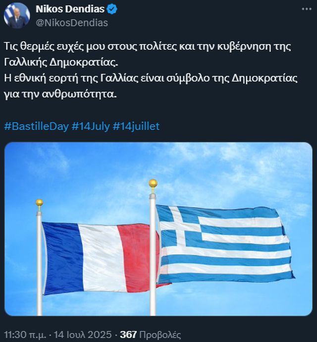 Με αφορμή την ημέρα της Άλωσης της Βαστίλης, που αποτελεί την εθνική επέτειο της Γαλλίας, ο Νίκος Δένδιας, μέσω ανάρτησης στην πλατφόρμα «Χ», εξέφρασε τις ευχές του προς τον γαλλικό λαό και την κυβέρνησή του, δηλώνοντας ότι εκφράζει τις θερμές του ευχές στους πολίτες και την κυβέρνηση της Γαλλικής Δημοκρατίας, προσθέτοντας ότι η εθνική εορτή της Γαλλίας αποτελεί σύμβολο της Δημοκρατίας για την ανθρωπότητα.