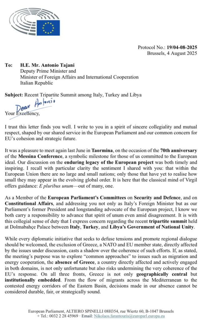 Επιστολή απέστειλε τη Δευτέρα 04/08 ο ευρωβουλευτής και μέλος της Επιτροπής Ασφάλειας & Άμυνας του Ευρωπαϊκού Κοινοβουλίου Νικόλας Φαραντούρης στον Αντιπρόεδρο της ιταλικής κυβέρνησης και Υπουργό Εξωτερικών Αντόνιο Ταγιάνι σε συνέχεια της πρόσφατης τριμερούς Ιταλίας-Τουρκίας-Λιβύης στην Κωνσταντινούπολη.