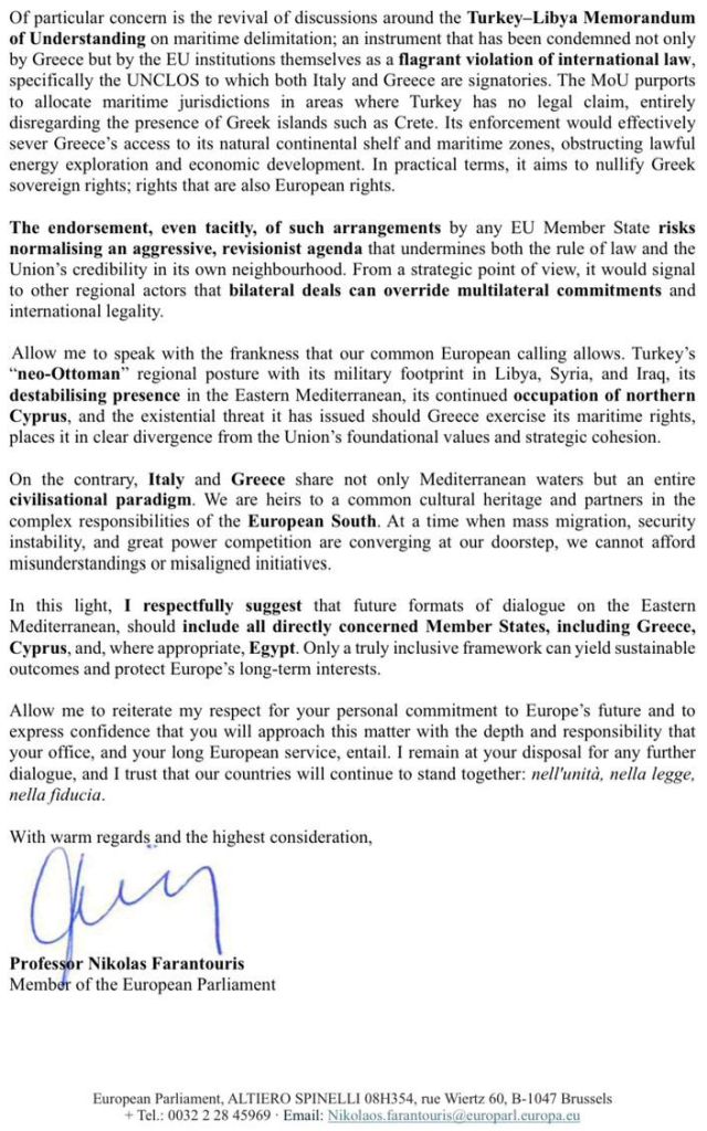 Όπως επισημαίνει στην επιστολή του ο Νικόλας Φαραντούρης, «στην τριεθνή Ιταλίας-Τουρκίας-Λιβύης η Ελλάδα αγνοήθηκε και αυτό δεν μπορεί να περάσει απαρατήρητο».