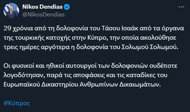 Σε ανάρτησή του στην πλατφόρμα «Χ», ο υπουργός υπογράμμισε ότι πριν από 29 χρόνια ο Τάσος Ισαάκ έπεσε θύμα δολοφονίας από όργανα της τουρκικής κατοχής στην Κύπρο, ενώ τρεις ημέρες αργότερα ακολούθησε η δολοφονία του Σολωμού Σολωμού.