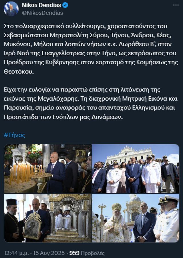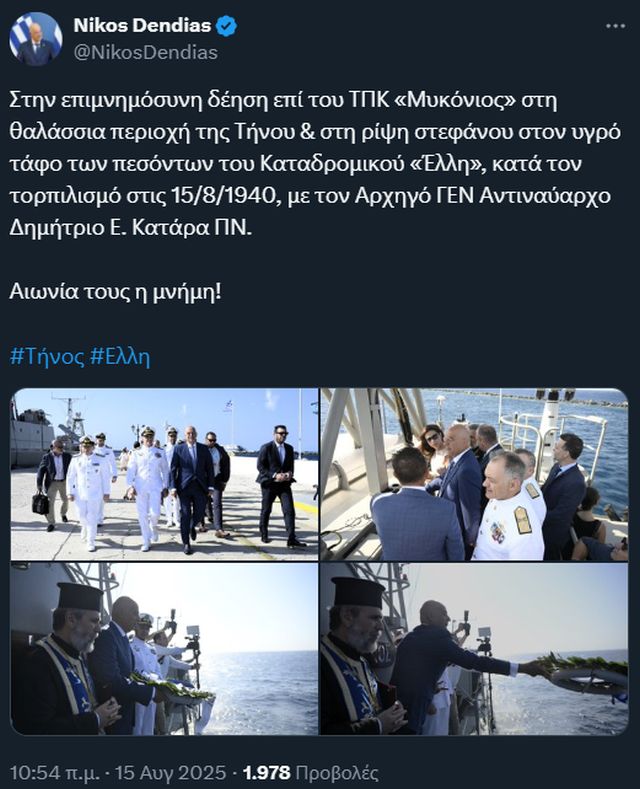 Ο Υπουργός Εθνικής Άμυνας Νίκος Δένδιας εκπροσώπησε τον Πρόεδρο της Κυβέρνησης την Παρασκευή 15 Αυγούστου 2025, στον εορτασμό της Κοιμήσεως της Θεοτόκου και στην επιμνημόσυνη δέηση για την 85η επέτειο από τον τορπιλισμό του Καταδρομικού «ΕΛΛΗ», στην Τήνο.