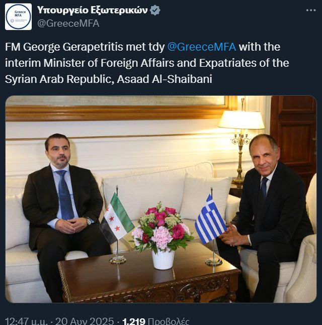 Η Εκπρόσωπος του Υπουργείου Εξωτερικών της Ελλάδας, Λάνα Ζωχιού, δήλωσε ότι ο Υπουργός Εξωτερικών, Γιώργος Γεραπετρίτης, συναντήθηκε στην Αθήνα, την Τετάρτη 20 Αυγούστου, με τον μεταβατικό Υπουργό Εξωτερικών και Αποδήμων της Συρίας, Ασάαντ Αλ-Σαϊμπάνι.