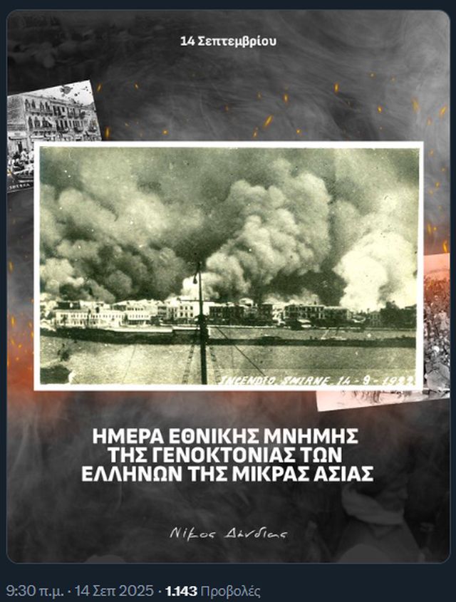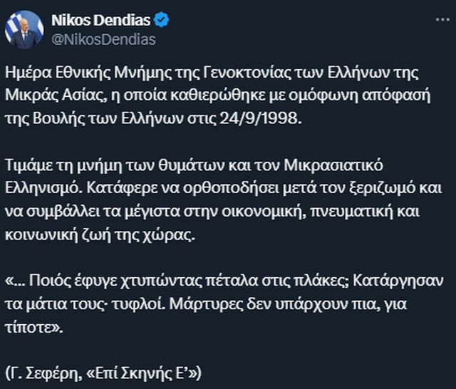 Ο Υπουργός Εθνικής Άμυνας, Νίκος Δένδιας, σε ανάρτησή του στο «Χ» την Κυριακή, 14 Σεπτεμβρίου 2025, αναφέρθηκε στην Ημέρα Εθνικής Μνήμης της Γενοκτονίας των Ελλήνων της Μικράς Ασίας, η οποία καθιερώθηκε με ομόφωνη απόφαση της Βουλής των Ελλήνων στις 24/9/1998.