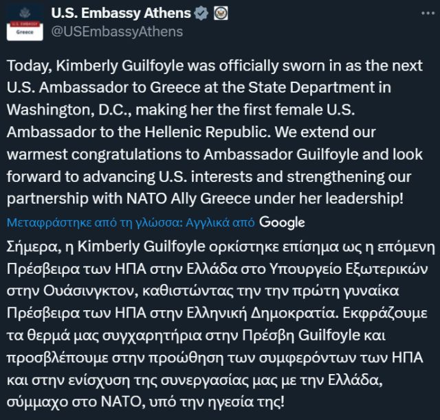 «Εκφράζουμε τα θερμότερα συγχαρητήριά μας στην Πρέσβη Γκίλφοϊλ και ανυπομονούμε να προωθήσουμε τα συμφέροντα των ΗΠΑ και να ενισχύσουμε τη συνεργασία μας με τον σύμμαχο του ΝΑΤΟ, την Ελλάδα, υπό την ηγεσία της!» αναφέρεται στο μήνυμα που δημοσιεύθηκε.