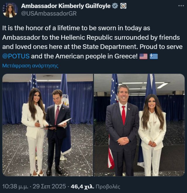 Επίσημη ανάληψη καθηκόντων για την Κίμπερλι Γκίλφοϊλ (Kimberly Guilfoyle), η οποία ορκίστηκε ως η επόμενη Πρέσβης των Ηνωμένων Πολιτειών στην Ελλάδα. Η τελετή πραγματοποιήθηκε στο Στέιτ Ντιπάρτμεντ, στην Ουάσιγκτον, D.C., με την Γκίλφοϊλ να γίνεται η πρώτη γυναίκα Πρέσβης των ΗΠΑ στην Ελληνική Δημοκρατία.