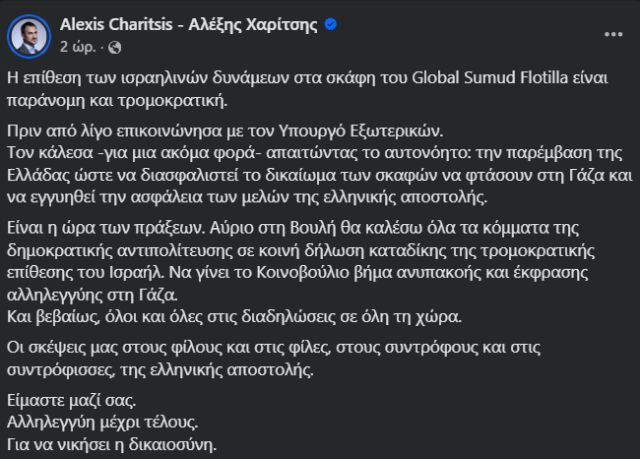 «Η επίθεση των ισραηλινών δυνάμεων στα σκάφη του Global Sumud Flotilla είναι παράνομη και τρομοκρατική.