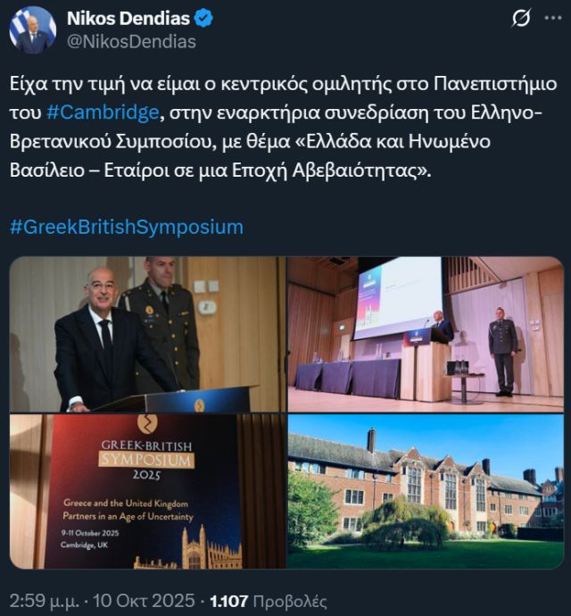Ο Υπουργός Εθνικής Άμυνας, Νίκος Δένδιας, πραγματοποίησε την κεντρική ομιλία κατά την εναρκτήρια συνεδρίαση την Παρασκευή 10 Οκτωβρίου 2025, του 9ου Ελληνο-Βρετανικού Συμποσίου, στο Πανεπιστήμιο του Cambridge (Jesus College), στο Ηνωμένο Βασίλειο, με θέμα: «Greece and the United Kingdom – partners in an age of uncertainty».