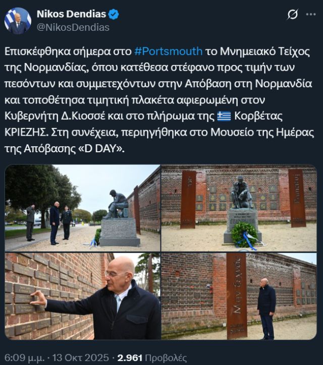 «Επισκέφθηκα σήμερα στο Portsmouth το Μνημειακό Τείχος της Νορμανδίας, όπου κατέθεσα στέφανο προς τιμήν των πεσόντων και συμμετεχόντων στην Aπόβαση στη Νορμανδία και τοποθέτησα τιμητική πλακέτα αφιερωμένη στον Κυβερνήτη Δ. Κιοσσέ και στο πλήρωμα της ελληνικής Κορβέτας ΚΡΙΕΖΗΣ. Στη συνέχεια, περιηγήθηκα στο Μουσείο της Ημέρας της Απόβασης “D DAY”».