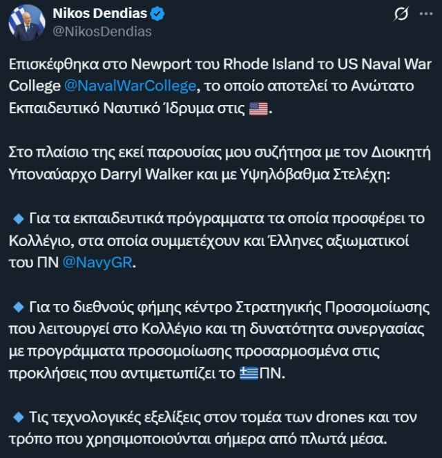 Όπως ανέφερε ο ίδιος ο Νίκος Δένδιας σε ανάρτησή του στην πλατφόρμα «Χ»: