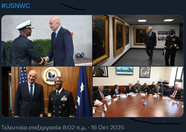 Ο Υπουργός Εθνικής Άμυνας, Νίκος Δένδιας, πραγματοποιεί επίσκεψη στις Ηνωμένες Πολιτείες, όπου την Τετάρτη, 15 Οκτωβρίου 2025, βρέθηκε στην Αμερικανική Ναυτική Ακαδημία Πολέμου, στο Νιούπορτ του Ρόουντ Άιλαντ, κοντά στη Βοστώνη.