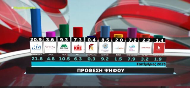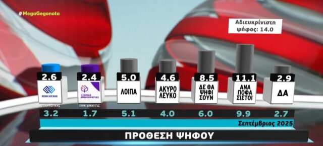 Ακολουθούν το ΚΚΕ με 7,3% (από 6,3%), η Πλεύση Ελευθερίας με 7,2% (από 7,9%) και ο ΣΥΡΙΖΑ με 3,6% (από 4,8%), ενώ η αδιευκρίνιστη ψήφος διαμορφώνεται στο 14%.