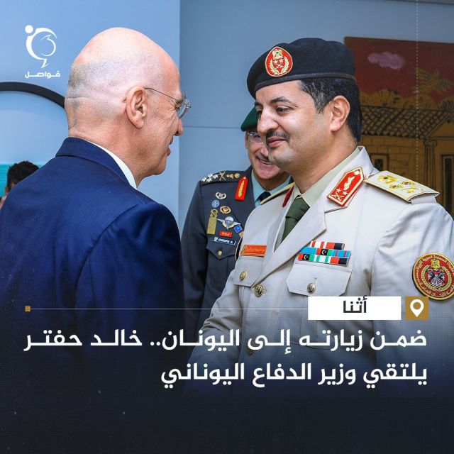 Κατά την παρουσία του στην ελληνική πρωτεύουσα, ο Χαλέντ Χάφταρ συναντήθηκε με τον Έλληνα Υπουργό Εθνικής Άμυνας, Νίκο Δένδια.