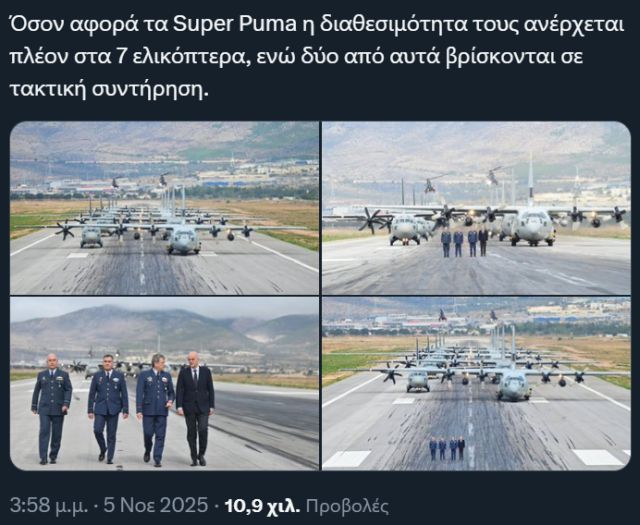 »Και τα Super Puma -δύο τα είδατε να ίπτανται πάνω από τον διάδρομο-, έχουν φτάσει σε διαθεσιμότητα των επτά. Δύο και από αυτά βρίσκονται σε τακτική συντήρηση.