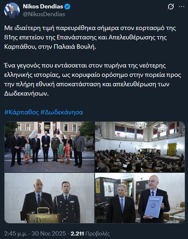 Ο Υπουργός Εθνικής Άμυνας Νίκος Δένδιας παρέστη την Κυριακή 30 Νοεμβρίου 2025, ως εκπρόσωπος του Προέδρου της Ελληνικής Κυβέρνησης, στην εκδήλωση εορτασμού της 81ης επετείου της Επανάστασης της 5ης Οκτωβρίου και της Απελευθέρωσης της Καρπάθου το 1944, η οποία διεξήχθη στο Μέγαρο της Παλαιάς Βουλής στην Αθήνα.