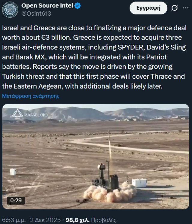 Ενίσχυση της ελληνικής αεράμυνας με ισραηλινά συστήματα. Σύμφωνα με πληροφορίες που δημοσιεύθηκαν στον λογαριασμό Open Source Intel της πλατφόρμας «Χ» (πρώην Twitter), η Ελλάδα και το Ισραήλ βρίσκονται κοντά στην ολοκλήρωση μιας σημαντικής αμυντικής συμφωνίας εκτιμώμενης αξίας περίπου 3 δισεκατομμυρίων ευρώ.