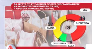 Σύμφωνα με την έρευνα της Alco, το 49% των ερωτηθέντων δηλώνει ότι «θα δαπανήσει λιγότερα» από πέρυσι στις φετινές γιορτές, με το 37% να απαντά ότι «θα δαπανήσει τα ίδια», ενώ μόλις το 8% δηλώνει ότι «θα δαπανήσει περισσότερα» από το προηγούμενο έτος.