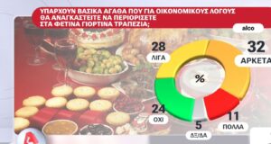 Σε ερώτηση αν υπάρχουν βασικά αγαθά που για οικονομικούς λόγους θα αναγκαστούν να περιορίσουν στα φετινά γιορτινά τραπέζια, το 32% απαντά «αρκετά», το 28% «λίγα», το 11% «πολλά», ενώ το 24% δηλώνει ότι δεν θα αναγκαστεί να κάνει περικοπές.