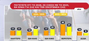 Περισσότεροι από τέσσερις στους δέκα πολίτες δηλώνουν ότι το 2025 ήταν «χειρότερο» από το 2024, σύμφωνα με το δεύτερο μέρος της δημοσκόπησης της Alco, ενώ ανήσυχοι εμφανίζονται ως προς το 2026 και αν θα μπορούν να τα βγάλουν πέρα.