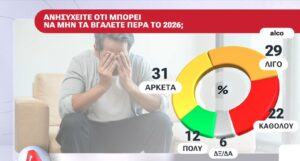 Σύμφωνα με την ίδια έρευνα, το 31% δηλώνει ότι «ανησυχεί αρκετά» ότι μπορεί να μην τα βγάλει πέρα το 2026, το 29% «ανησυχεί λίγο», το 12% τονίζει ότι «ανησυχεί πολύ», εν το 22% «δεν ανησυχεί καθόλου».