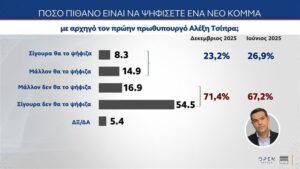 Στην ερώτηση πόσο πιθανόν είναι να ψηφίσετε ένα νέο κόμμα με αρχηγό τον Αλέξη Τσίπρα, το 23,2% λέει ότι θα το ψήφιζε ενώ το 71,4% δηλώνει ότι δεν θα το επέλεγε.