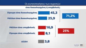 Δικαιολογημένες χαρακτηρίζει τις κινητοποιήσεις των αγροτών το 71,2% ενώ υπερβολικές τις κρίνει το 25%.