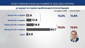 Στην ερώτηση πόσο πιθανόν είναι να ψηφίσετε ένα νέο κόμμα με αρχηγό τον Αντώνη Σαμαρά, το 15,6% λέει ότι θα το ψήφιζε ενώ το 79,6% δηλώνει ότι δεν θα το επέλεγε.