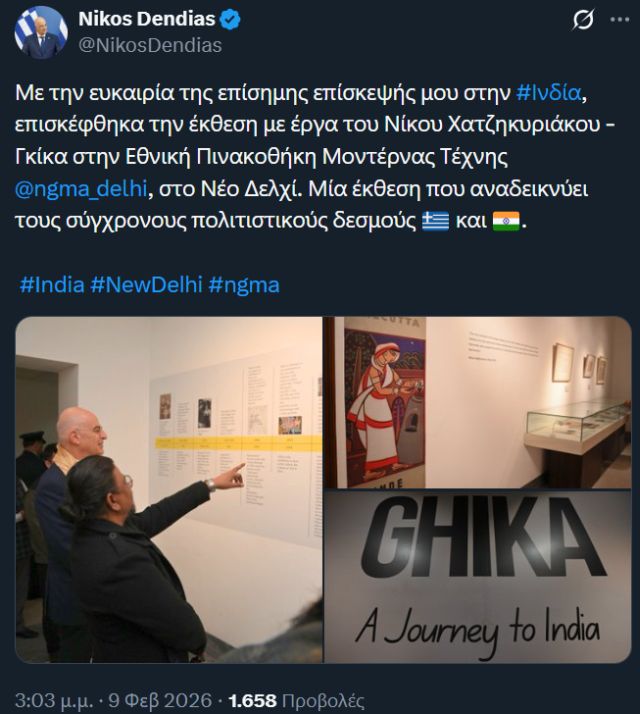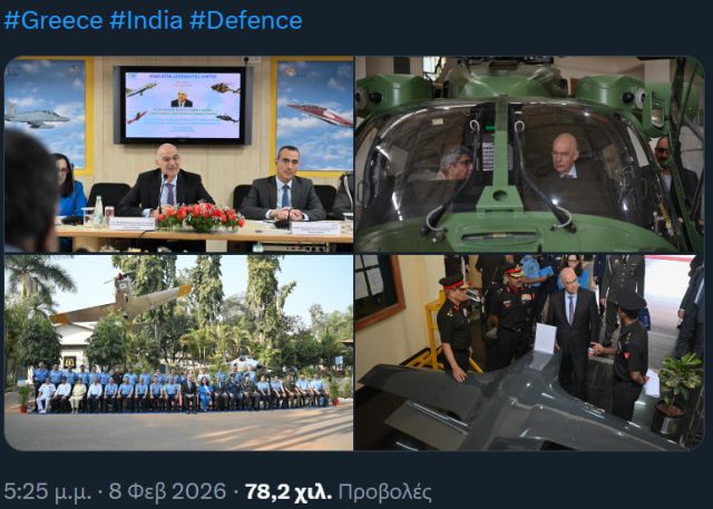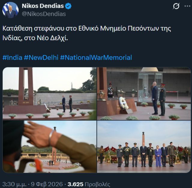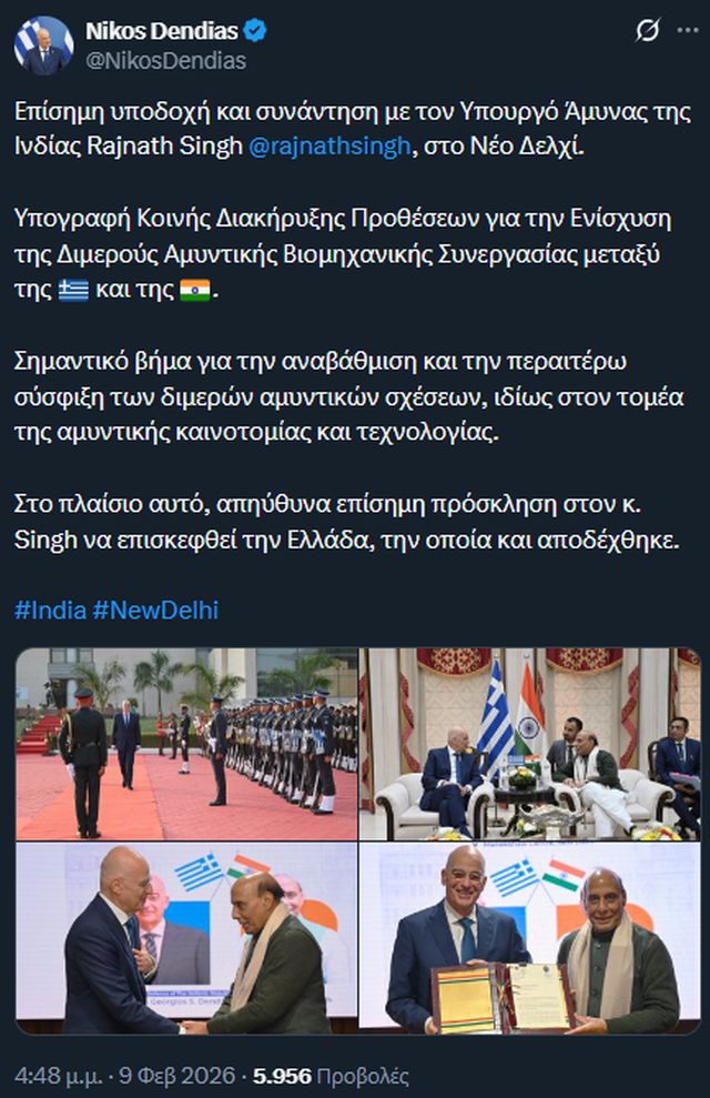 Ο Υπουργός Εθνικής Άμυνας Νίκος Δένδιας τη Δευτέρα 9 Φεβρουαρίου 2026, ολοκλήρωσε την επίσημη επίσκεψη του στην Ινδία, με την κατ’ ιδίαν συνάντηση με τον Υπουργό Άμυνας της Ινδίας Ράτζναθ Σινγκ (Rajnath Singh), στο Νέο Δελχί.