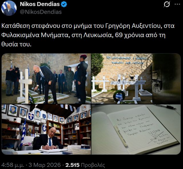 Σε μια κίνηση υψηλού συμβολισμού και εθνικής σημασίας, ο Υπουργός Εθνικής Άμυνας, Νίκος Δένδιας, απέτισε φόρο τιμής στον ήρωα του απελευθερωτικού αγώνα της ΕΟΚΑ, Γρηγόρη Αυξεντίου.