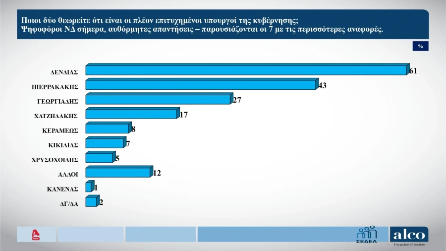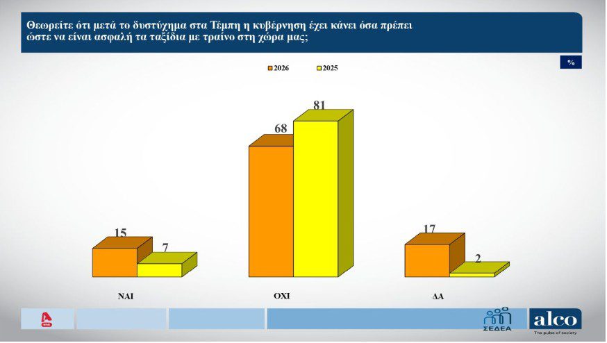 Η δεύτερη φάση της δημοσκόπησης της Alco, που παρουσιάστηκε το βράδυ της Τρίτης (10/03/2026) για τον ALPHA, αποτυπώνει έντονη δυσαρέσκεια των πολιτών για τον τρόπο με τον οποίο η κυβέρνηση διαχειρίστηκε την τραγωδία στα Τέμπη, ενώ αναδεικνύει ως επιτυχημένο πρόσωπο της κυβέρνησης τον Νίκο Δένδια, με τον πρωθυπουργό Κυριάκο Μητσοτάκη να κατακρίνεται από 3 στους 4 πολίτες.