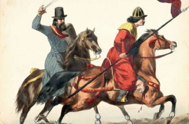 Έλληνες Stratioti διακρίνονται από τα ψηλά καπέλα τους.