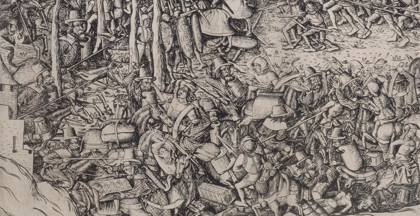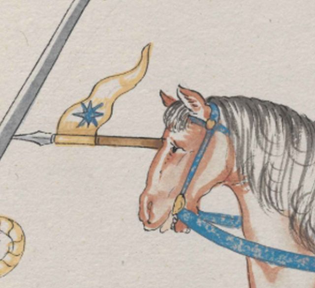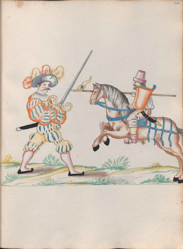 Έφιππος Stratioti με λόγχη εναντίον σε Landsknecht με σπαθί δύο χεριών, δείτε το σύμβολο στη σημαία του Stratioti.